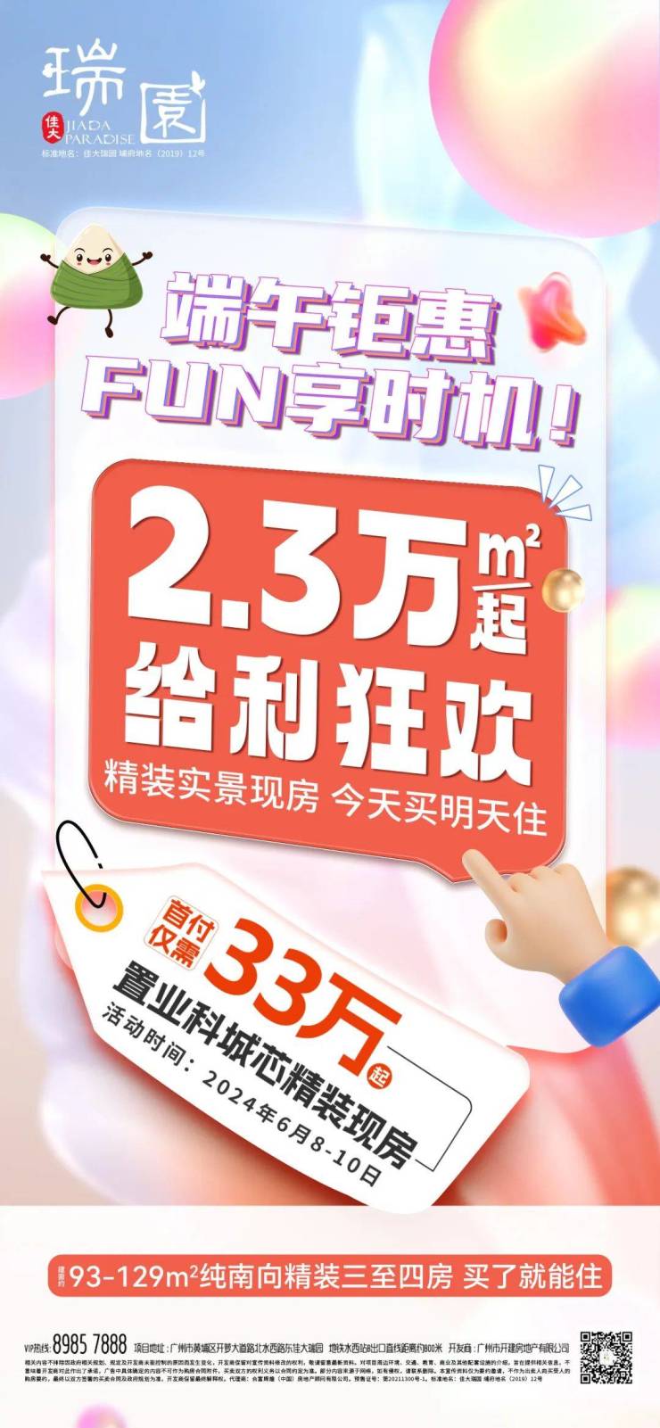 6月8日-10日,科学城芯现房佳大瑞园推出端午钜惠活动,单价2.3万/㎡起,首付仅需33万起即可入三房!