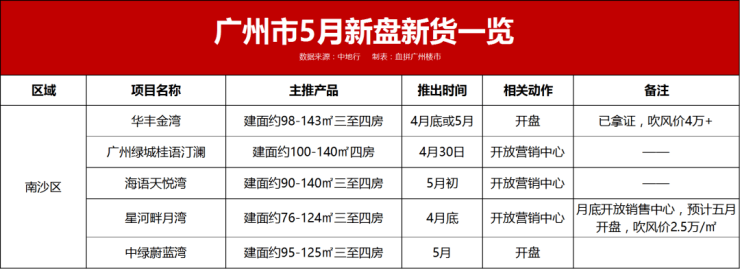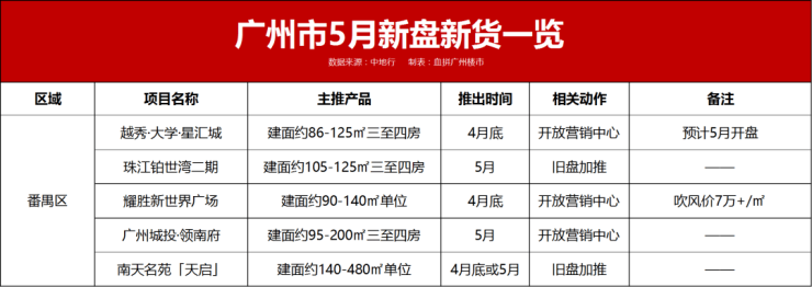 番禺区5月预计5项目有营销动作,其中珠江铂世湾二期、南天名苑「天启」加推新货。