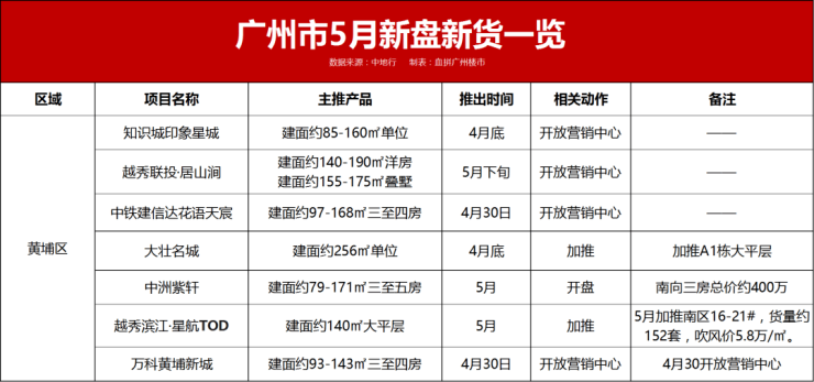 一直是置业焦点的黄埔区5月更是火热,预计8个项目有动作,包括开放营销中心、加推新货、开盘、开放样板房。