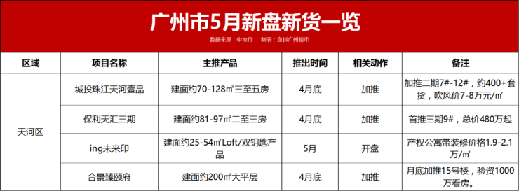 天河区4月底或5月将有城投珠江天河壹品、保利天汇三期、合景臻颐府这三大热盘加推新货。