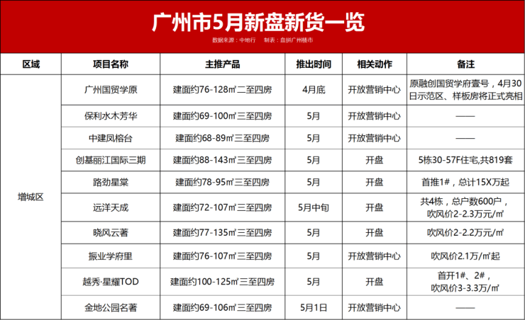 堪称“东大仓”的增城5月将有10个项目推出营销动作,其中路劲星棠、远洋天成、晓风云著、越秀·星耀TOD将正式开盘。