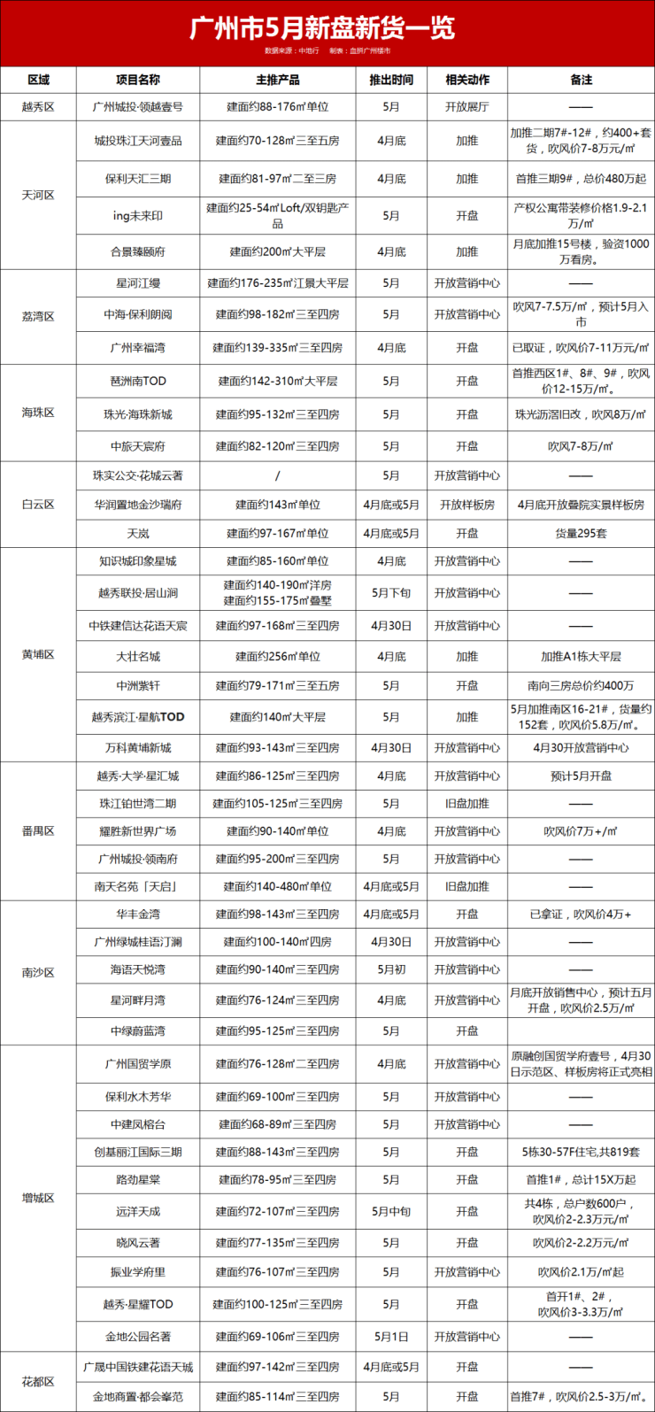 据搜狐焦点广州站、中地行不完全统计,5月份广州约43个项目有营销动作,包括开放营销中心、开放样板房、加推新货、开盘等等。