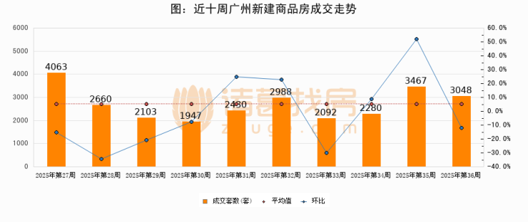 进入2025年第36周(09月01日-09月07日),广州新建商品房成交3048套,较上周减少419套,环比下降12.1%。从近十周成交来看,周均成交套数为2707套,本周成交3048套,高于近十周平均成交量12.6%。