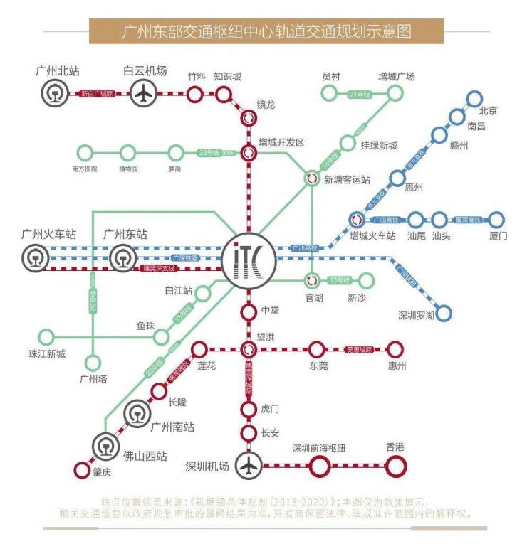 但,这又不是一个简单的TOD项目,九轨交汇于此,汇集三条国家高铁(广深高铁、广汕高铁、京九高铁)、两条城际轨道(穗莞深城轨、新白广城轨)、四条城市地铁(13号线、16号线、28号线、20号线),并与出租车、汽车客运等搭建一体化公交网络系统,形成新时代的“轨道高速生活圈”,极大地满足居民出行、生活、休闲的需求。