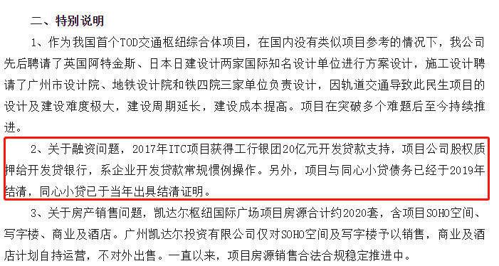 这一点,在凯达尔2021年的官方回应中表示,2017年ITC项目获得工行银团20亿元开发贷款支持,项目公司股权质押给开发贷银行,系企业开发贷款常规惯例操作。另外,项目与同心小贷债务已经于2019年结清,同心小贷已于当年出具结清证明。