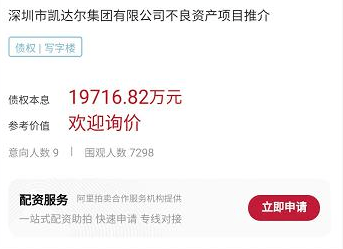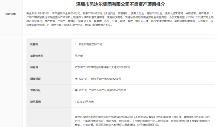 此次拍卖涉及深圳市凯达尔集团部分债权。此前,深圳凯达尔集团以“凯达尔枢纽国际广场西塔37层至43层(不含38层设备层)共186套在建工程”作为抵押,负有中国华融本金+利息约2亿债务(1.9716亿)。