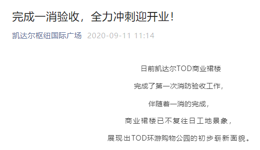 2020年9月,凯达尔枢纽国际广场官微发文,项目商业裙楼完成了排名前列次消防验收工作,各品牌商户将于9月15日陆续进场装修。全国排名前列“TOD环游购物公园”——凯达尔印象城迎来冲刺阶段,即将精彩亮相!