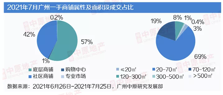 属性分布:20-70㎡面积段占比约7成受花都区单盘批量交易影响,本月底商占比超越社区商铺,达57%,社区商铺占比为42%。20-70㎡主力面积段商铺成交占比提升至7成左右,70-120㎡成交维持在2成左右。