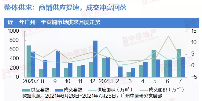 进入下半年,广州商业项目入市提速,商铺供应随之增加。本月广州商铺市场供应622套4.16万㎡,环比涨幅达61%。商铺市场成交回归常态,较6月高位(年内峰值12.92万㎡)下跌73%,为448套3.54万㎡。区域表现:花都、黄埔两区成交逆势增长