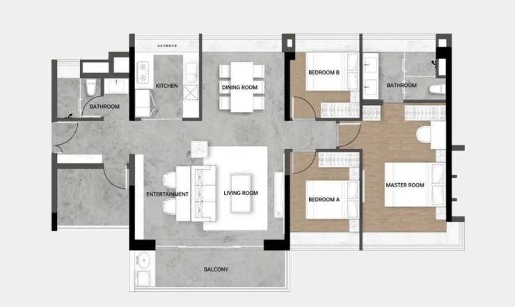 另外,该户型多个空间都带有飘窗设计,实用率高。
