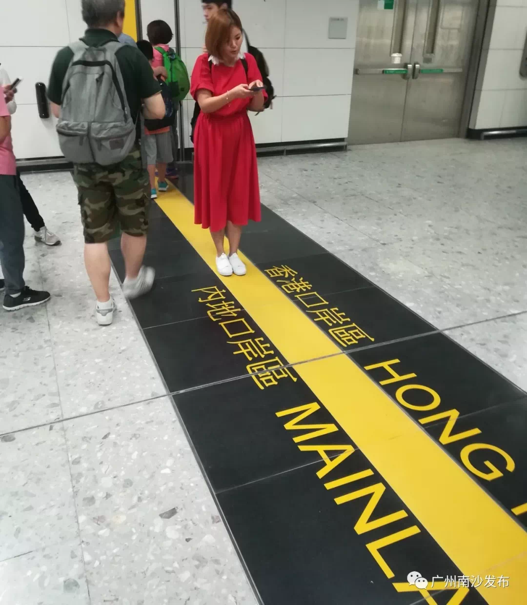 在出境后,步行3、400米就会看到内地口岸区和香港口岸区的分界线。许多旅客在进行拍照留念。