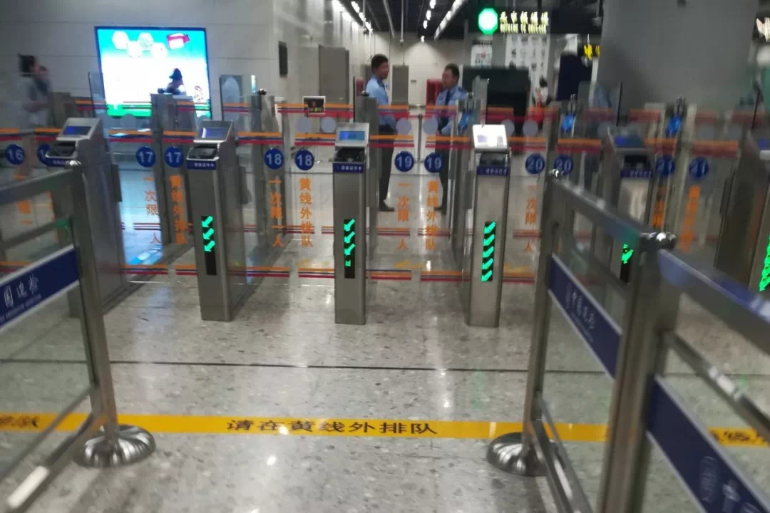 在香港西九龙车站乘坐开向内地的列车也十分方便。在B1层购票或取票后,经过大厅右侧的3个闸机验票,随后对随身行李进行安检。再乘坐扶手电梯,下到B3离境层。和入境层的办理程序差不多,先办理香港出境程序,离开“香港口岸区”。然后进入同一层的“内地口岸区”办理内地入境程序,随后前往候车区。
