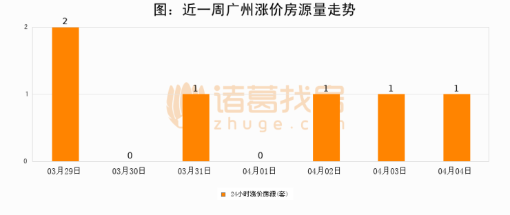 根据诸葛找房数据显示,广州24小时涨价房源量为1套,较04月03日持平。