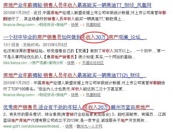 这样看来,房地产企业老总平均每年的收入能抵的上几十个一线销售人员的收入,差距还是比较大的。不过近年来房地产销售的工资也在快速增长。58同城招聘版块大部分房地产公司销售人员薪资都在已经在一万以上。