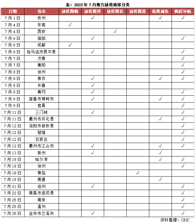 7月,“保交楼”首次被写入政治局会议文件,银保监会表态千方百计推动保交楼,郑州、宁波、咸阳等城市召开房企座谈会,“一楼一策一专班”落实保交付。49省市出台52次放松政策,并下沉到嘉善等县级,西安、成都等13城二手房参考价制度实质性取消。