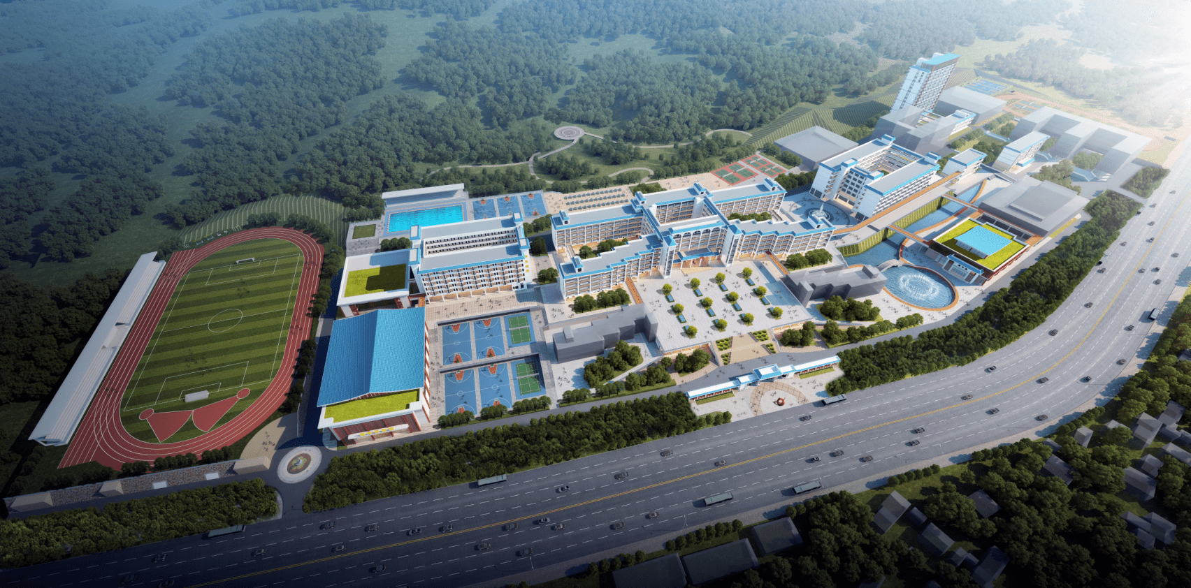 为此,结合现状地形、学校功能需求,项目规划主要教学区、运动区、生活区、预留发展区等,形成功能分区明确、交通流线简洁、环境景观舒适、良好校园互动的组合空间。建筑又以分级台地、半地下空间来综合利用地形坡度,高度自南向北呈现“前高后低”的层次感,并结合北部山体轮廓线打造丰富的天际线景观。