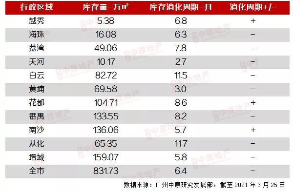 由于2、3月供应量明显减少,导致整体库存面积回落,黄埔、天河、南沙、荔湾等区基本以消化现有存货为主,导致整体去化周期再次“探底”。