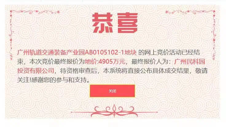 AB0105102-1地块面积为32504平方米,由广州民科园投资有限公司以4905万元竞得,将建设产研办结合的轨道交通装备产业基地。
