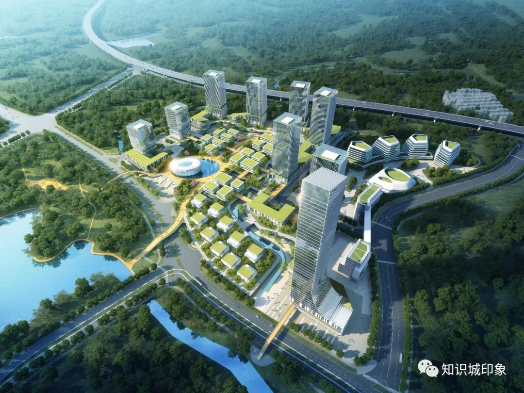 知识城广场效果图(注:图中部分多层办公楼位置与实际略有出入,应在圆球体建筑左侧)