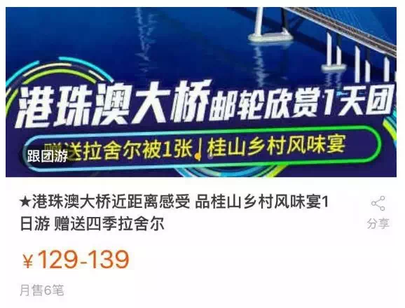 虽然还没通车,“大桥游”已经成为爆品,广州、珠海等地的部分旅行社纷纷揽客坐游轮看港珠澳大桥,旅行平台甚至推出大桥一日游活动。