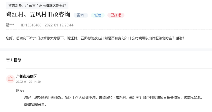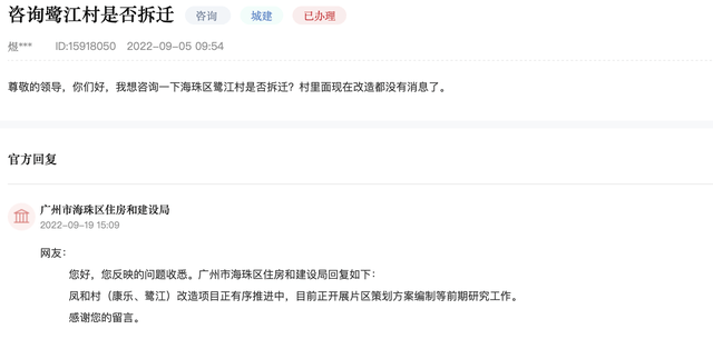 目前,凤和村(康乐、鹭江)改造项目仍有序推进中,正开展片区策划方案编制等前期研究工作。