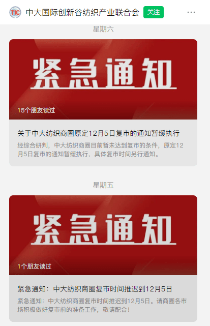 紧接着,12月2日凌晨,微信公众号“中大国际创新谷纺织产业联合会”发文为抑制疫情传播,中大纺织商圈复市时间推迟到12月5日。