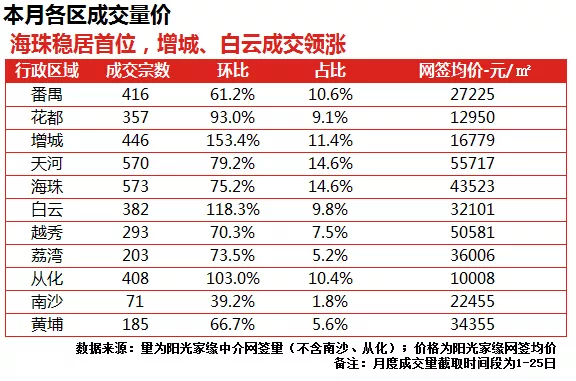 海珠稳居首位,增城、白云成交领涨从各区成交情况来看,本月各区成交量环比均呈现明显上升的趋势。其中,增城、白云、从化三区涨幅最为明显,1-25日分别成交446宗、382宗、408宗,环比2月同期分别上涨1.5倍、1.2倍、1.0倍。另外,本月海珠市场需求同样活跃,本月共成交573宗,环比上涨75.2%,成交排名稳居首位。