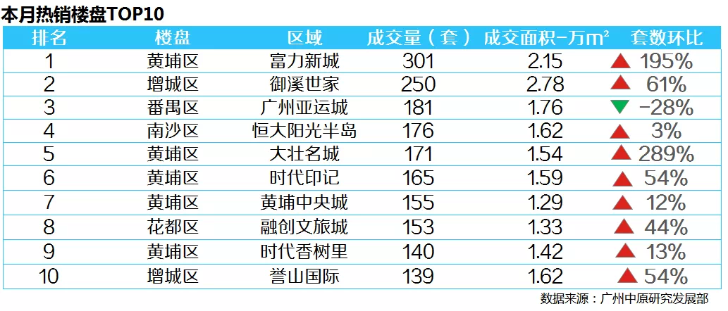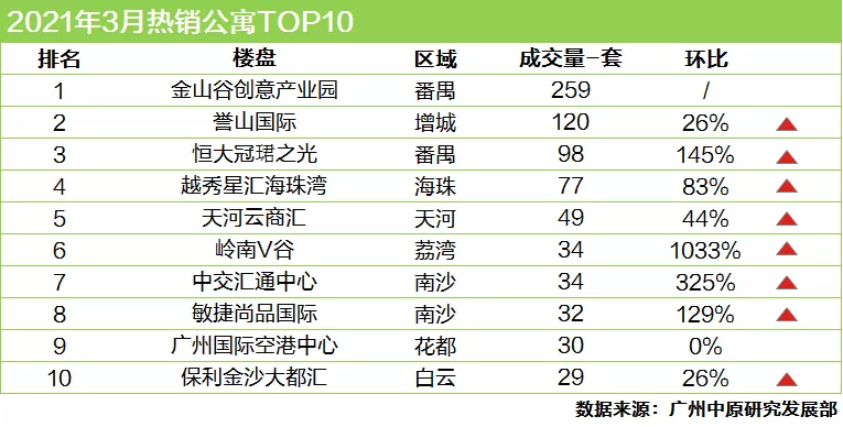 本月番禺区金山谷创意产业园以259套的销量领跑,占全市成交套数的22%。据悉,去年9月招商蛇口发布关联交易公告,由招商局仁和养老投资有限公司接盘番禺区东环街东艺路139号7-12栋(含地下室)物业,交易金额达5.72亿元。本月金山谷创意产业园批量确权部分即为项目的7-11栋。增城区誉山国际1字头双钥匙复式公寓新品销售稳定,以120套的销量位居第二。海珠区越秀星汇海珠湾加推高层47-79㎡的瞰江LOFT公寓,总价160万元起,去化77套。番禺区恒大冠珺之光本月推出75折限时优惠,公寓跑量98套。另外,天河区天河云商汇推出春天集市活动吸客,荔湾区岭南V谷价格调整,这两个项目的销量也有明显上升,挤进榜单第五、六位。