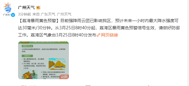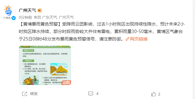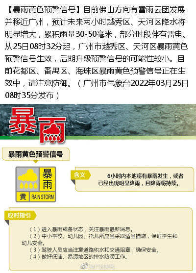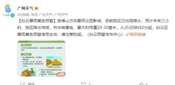 据@广州天气发布消息称,广州多区发布暴雨黄色预警,原文如下: