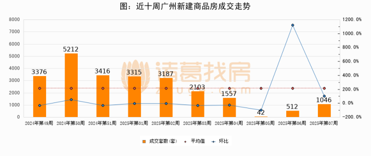 进入2025年第07周(02月10日-02月16日),广州新建商品房成交1046套,较上周增加534套,环比上涨104.3%