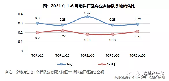 值得一提的是,克而瑞在《2021年1-6月中国房地产企业新增货值TOP100榜》中提到,在22城集中供地拍地模式带动下全国百强房企投资积极性显著回升,并且截至6月底,2021年上半年百强房企拿地销售比达到0.3,较一季度末的0.2大幅提升。