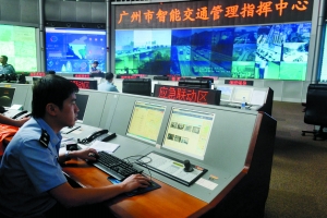 广州市智能交通管理指挥中心工作人员对“开四停四”实施路况进行监督反馈。