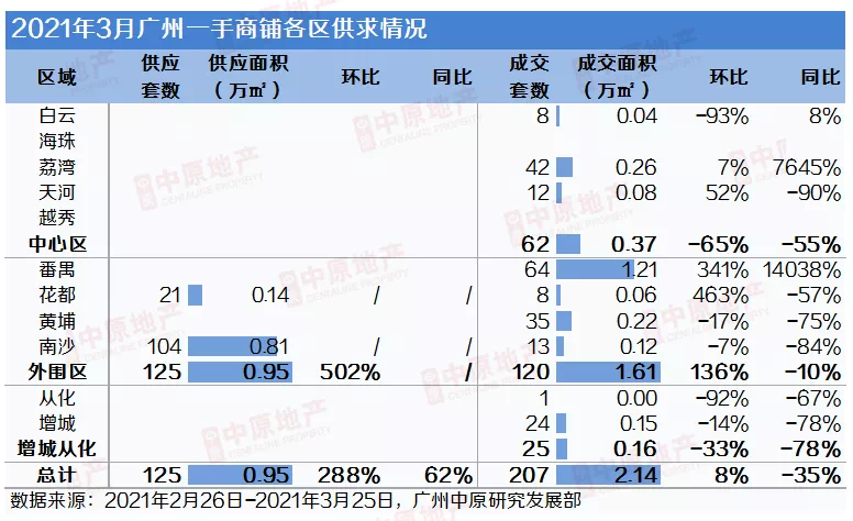 据监测,受住宅项目批售放缓影响,广州商铺供应同样收紧;不过市场供应在3月中旬开始释放。本月共入市125套0.95万㎡的商铺,供应量较上月低位约增长2.9倍。市场成交凭借个别项目的批量确权撑市,环比微涨8%,为207套2.14万㎡,市场整体仍处于节后复苏阶段。区域表现:主力区番禺独占近6成成交