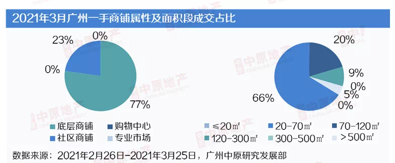 由于番禺敏捷广场的批量网签,本月底商成交占比达77%,社区商铺成交占比缩减至23%。20-70㎡主力面积段的商铺成交占比维持在66%。受确权大单影响,70-120㎡、300-500㎡的商铺占比分别扩大至20%、5%。
