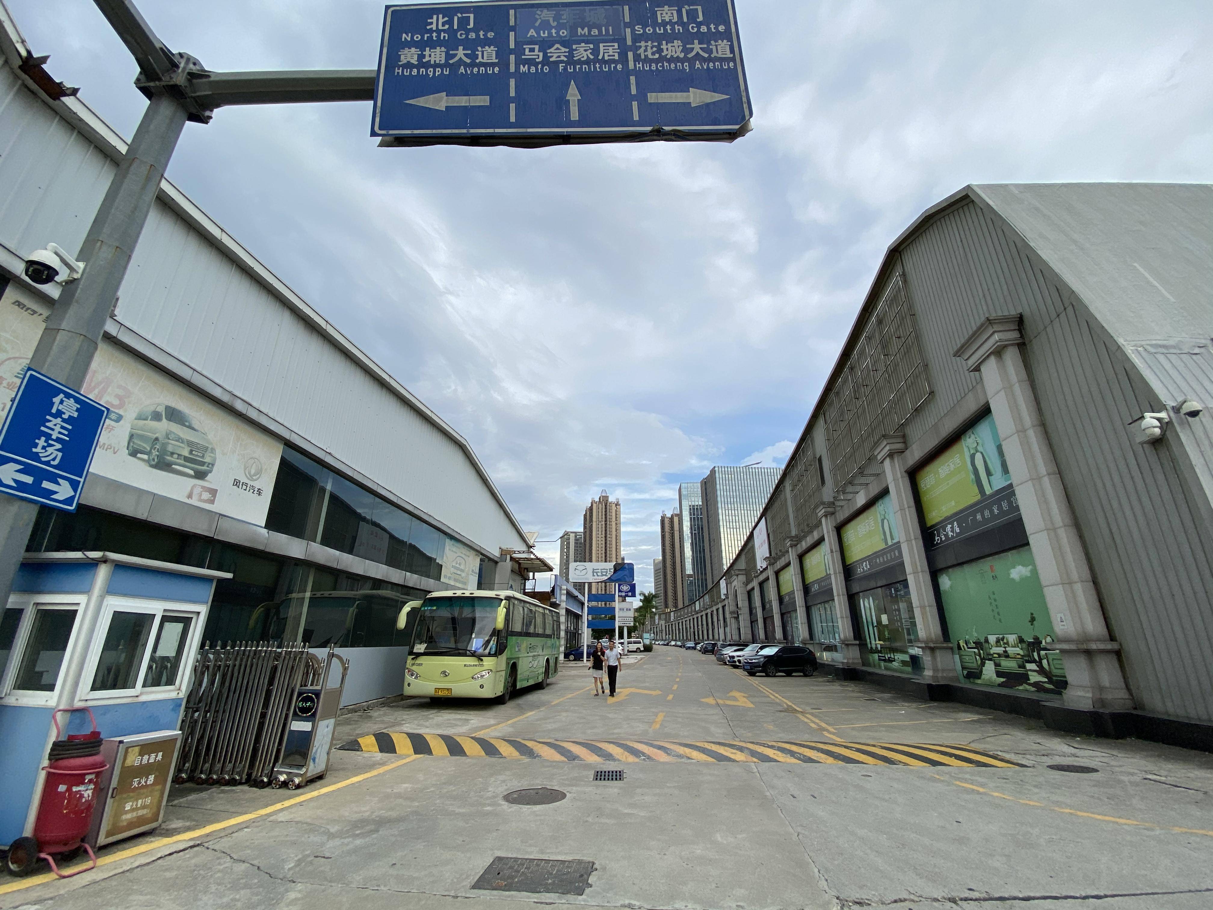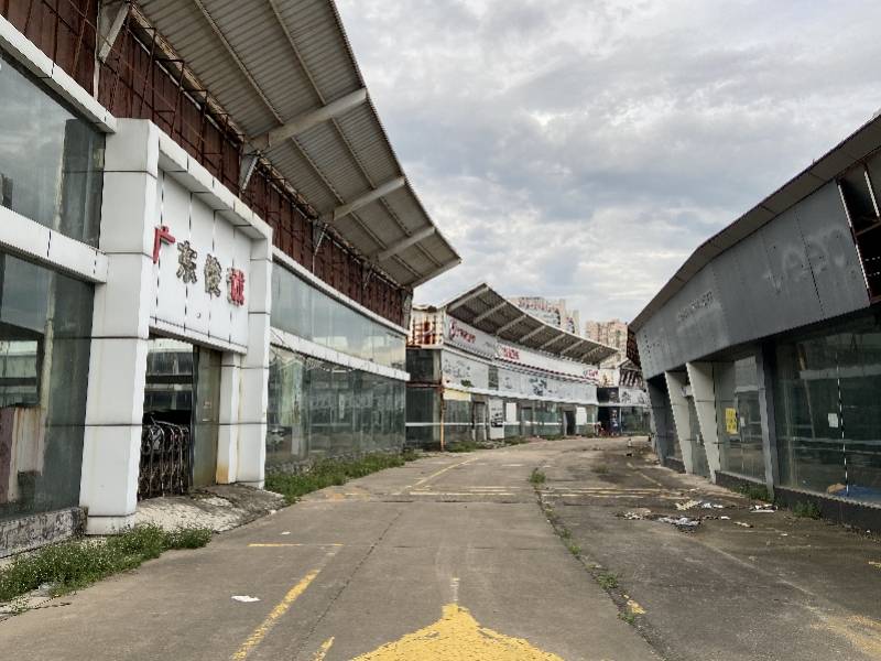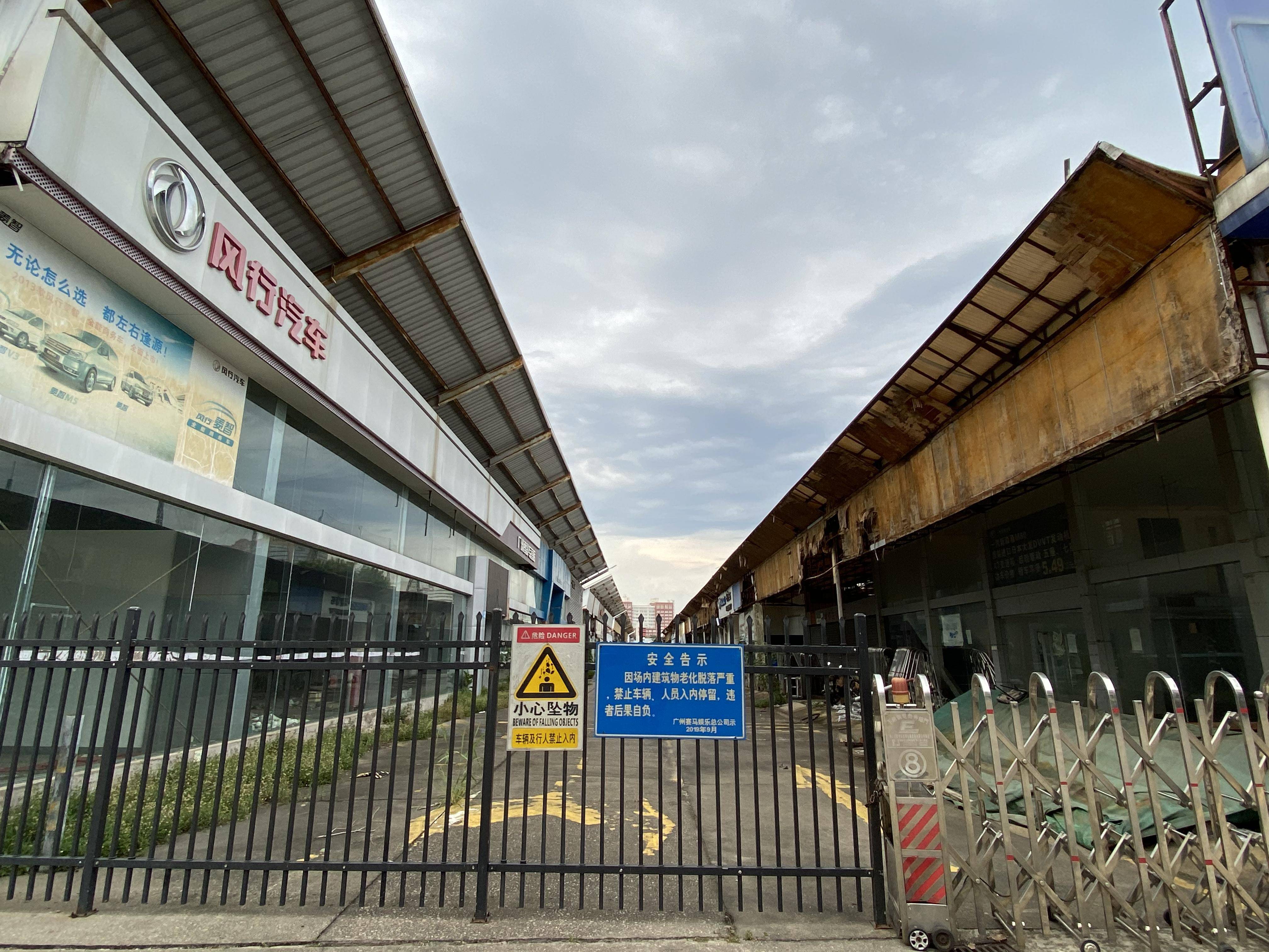 马场内大量汽车4S店已荒废闲置,挂出禁止车辆、人员入内的告示。