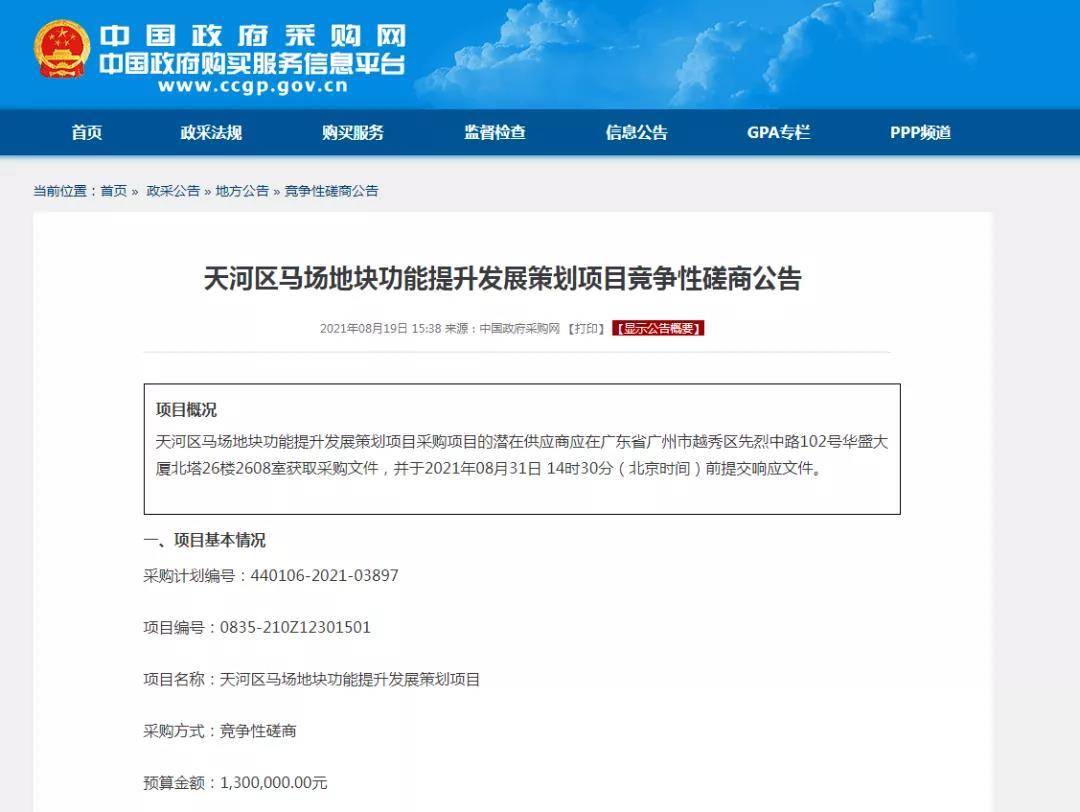 中国政府采购网日前挂出的一份《天河区马场地块功能提升发展策划项目竞争性磋商公告》(下称《公告》),将广州沉寂已久的天河赛马场再度拉回公众视野。