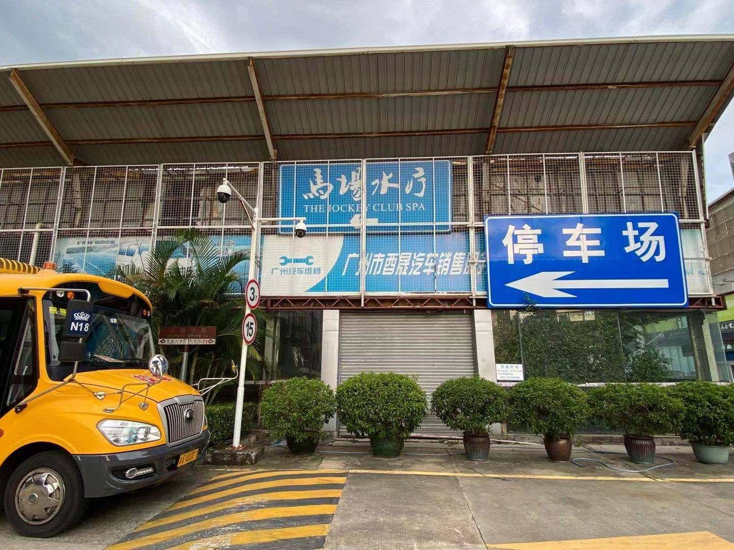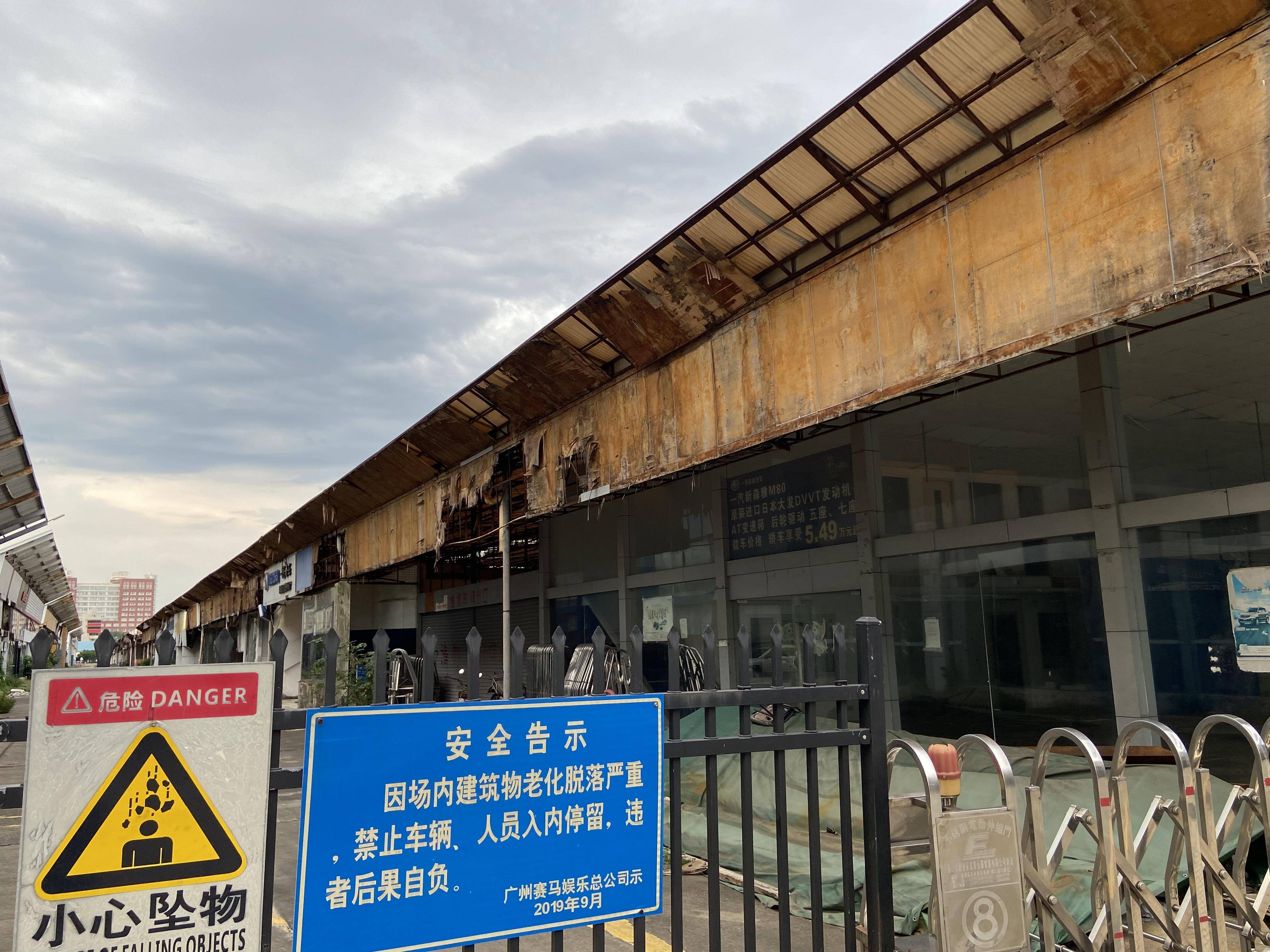 但往四周近处看,则多是一排排荒废闲置的汽车4S店和临时汽车展厅,展厅由铁栅栏围着,上边挂着广州赛马娱乐总公司在2019年9月发出的安全告示,“因场内建筑物老化脱落严重,禁止车辆、人员入内停留,违者后果自负。”