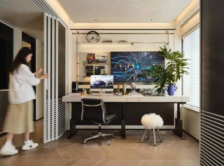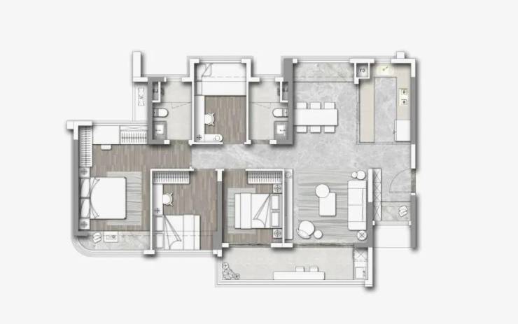 户型合理规划空间布局,全屋南向四开间,实现了南向资源充分占有。户型极大程度保证了各功能空间的舒适度,最小的房间也有约2.5米开间,能放标准双人床。次卧可改造为半开放式电竞房,与约3.7米客厅打通,形成南向面宽约6.2米、使用面积约52㎡的通透大空间,这等尺度足以与市面110㎡户型掰手腕。