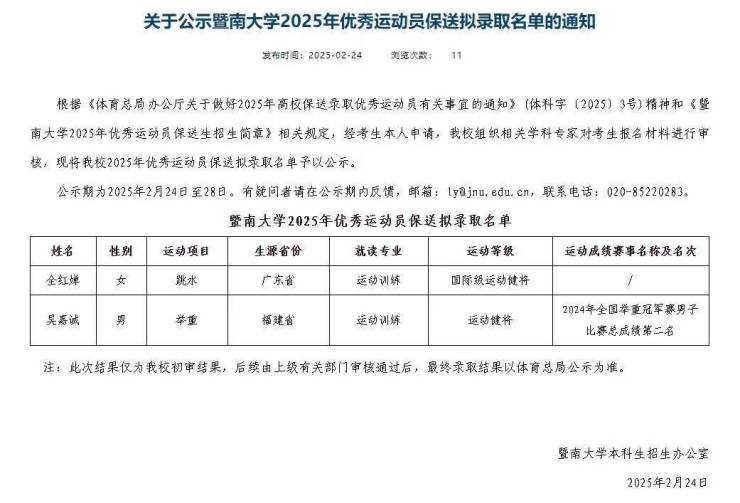 近日,暨南大学招生办公示了2025年优秀运动员保送拟录取名单,跳水运动员全红婵在列。如果保送成功,全红婵将与国际级运动健将苏炳添成为校友,进一步强化文体精英培养体系。
