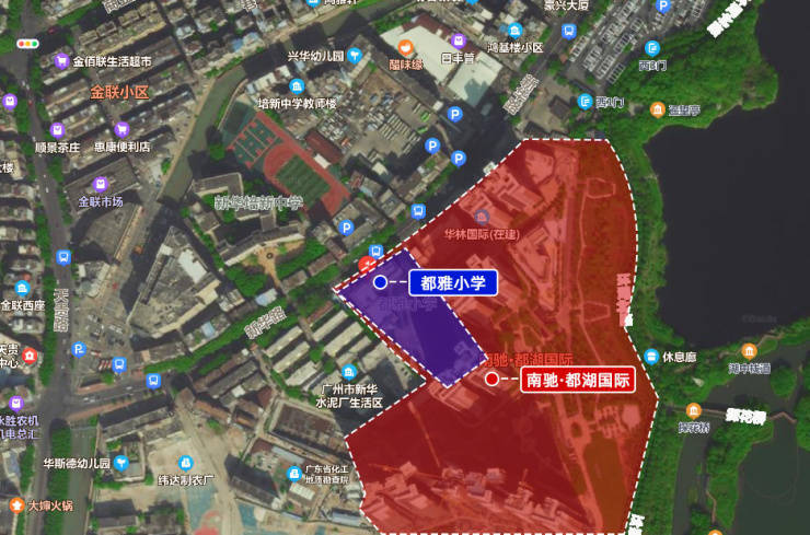 在地图上我们可以看出,都雅小学一侧紧邻新华路,另外一侧则被南驰·都湖国际“环抱”其中,只有一墙之隔的距离。