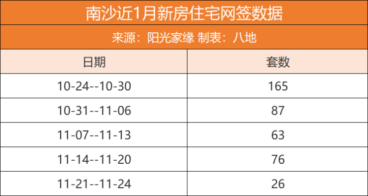 根据阳光家缘的数据显示,近1个月来,南沙的新房住宅网签套数一直处于低位徘徊,特别是进入11月之后,单周网签数量更是只有几十套。