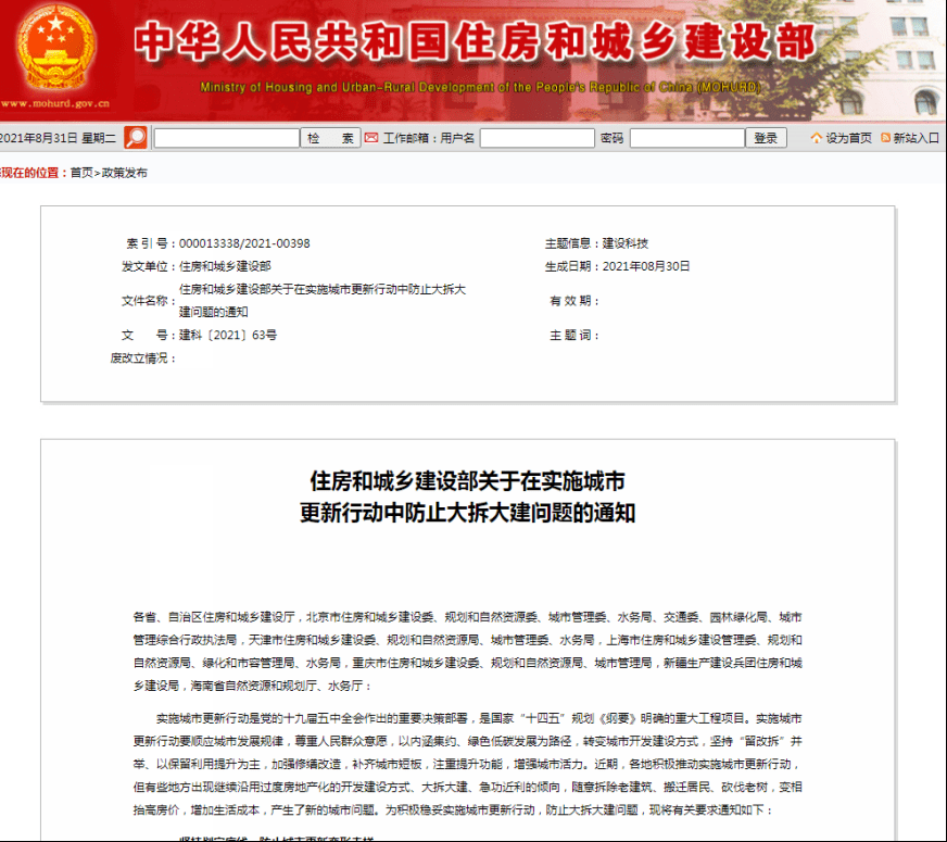 在公开征求意见20天后,住建部于8月30日正式发出《住房和城乡建设部关于在实施城市更新行动中防止大拆大建问题的通知》(下称《通知》),防止各城市在城市更新行动中大拆大建。