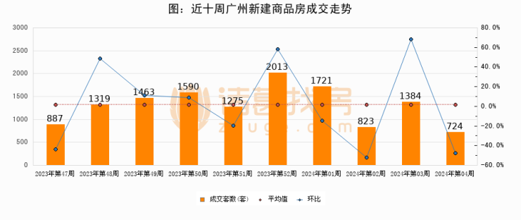 进入2024年第03周(01月15日-01月21日),广州新建商品房成交724套,较上周减少660套,环比下降47.7%