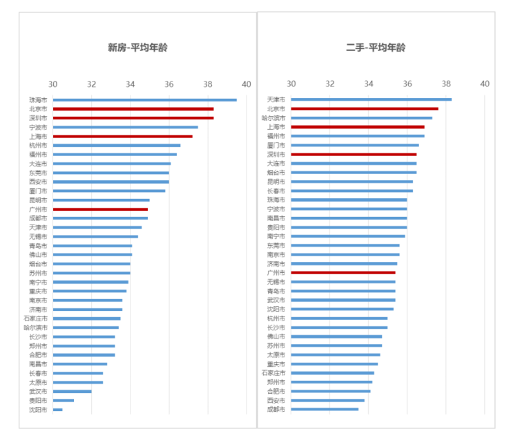 其中新新房置业者平均年龄位居统计的 35 个城市的第 20 位,二手置业者平均年龄位居 第 13 位,不仅明显小于一线城市,而且小于部分新一线、二线城市,整体处于 35 个典型 城市样本的中间水平。