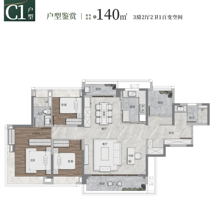 建面约140㎡户型则是东北朝向,可观江景和园景,该户型虽然也是沿用书亭设计,但是双阳台连通餐客厅,南北通透,居住舒适度高。