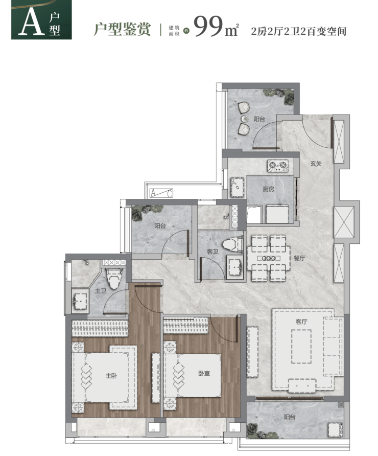 其中,建面约99㎡采用经典的竖厅设计,U型厨房实用率更高,且三开间朝南,虽不望江,但是通风采光俱佳。