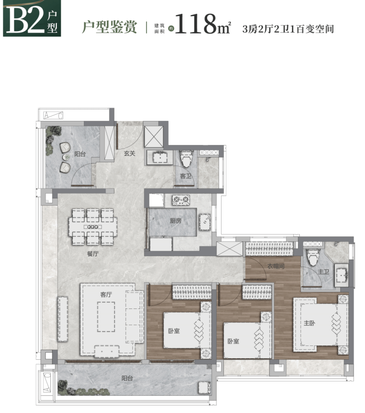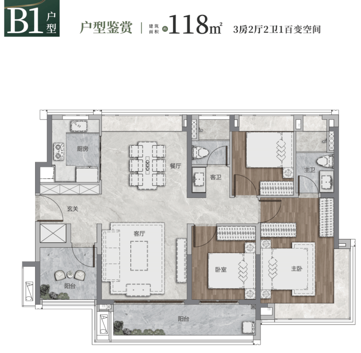其中,B1户型是西北朝向,采用竖厅设计,主卧带有270°飘窗,视野优质;B2户型则是东南朝向,采用横厅设计,空间敞亮,南北通透。