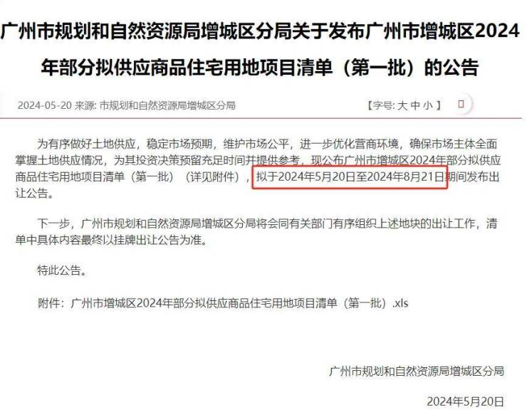 5月20日,增城区《广州市增城区2024年部分拟供应商品住宅用地项目清单(第一批)》,共2宗,分布于朱村街与荔湖街,总用地面积18.8公顷,总建筑面积15.3万方,拟于5月20日至8月21日期间发布出让公告。