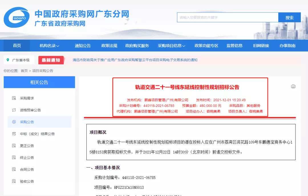 近日,广东省政府采购网发布广州地铁21号线东延线控制性规划招标公告,合同包预算金额48万元,不接受联合体投标。