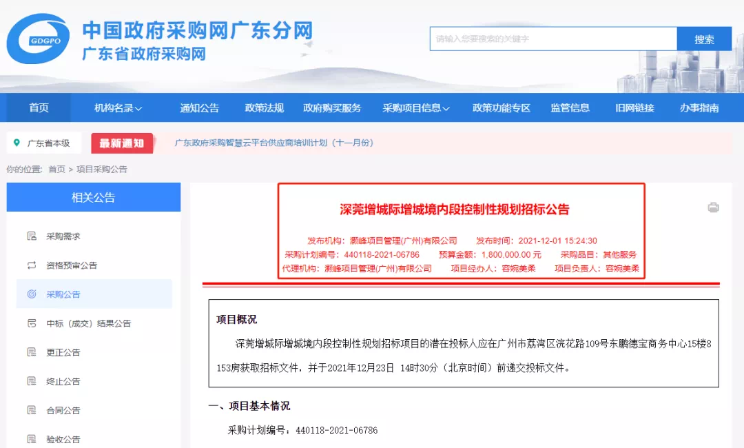 广东省政府采购网也发布了深莞增城际增城境内段控制性规划招标公告,合同预算金额180万元,不接受联合体投标。